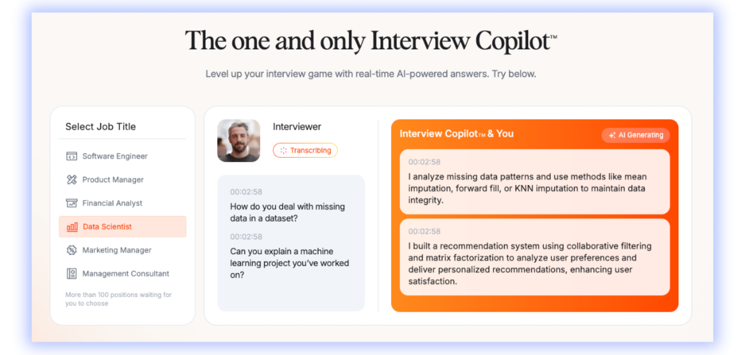 A new player: Final Round AI is an interview companion for you in Zoom, Webex, Google Meet, etc. The software secretly listens to and transcribes interview questions and then spits out a word-for-word script for the candidate to recite. Candidates can even feed their resume into Final Round so they have real-time AI assistance in talking about their resume experiences.
