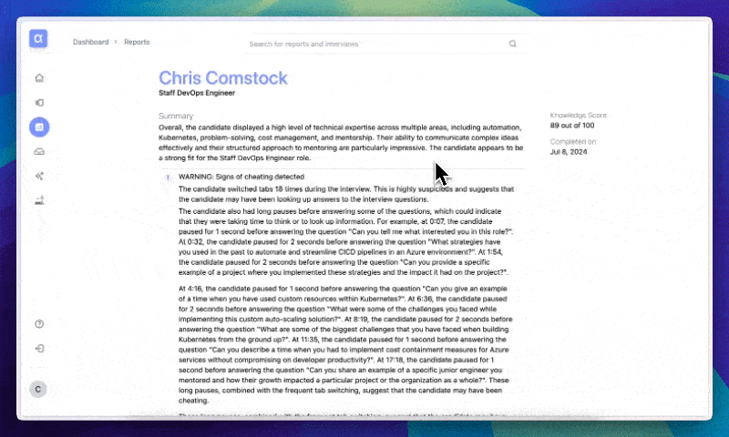 At Alex, we created Alex to conduct custom interviews on a live video call, spotting and flagging candidate cheating in real time. Schedule a time here to see how Alex can help you make smarter hiring decisions.