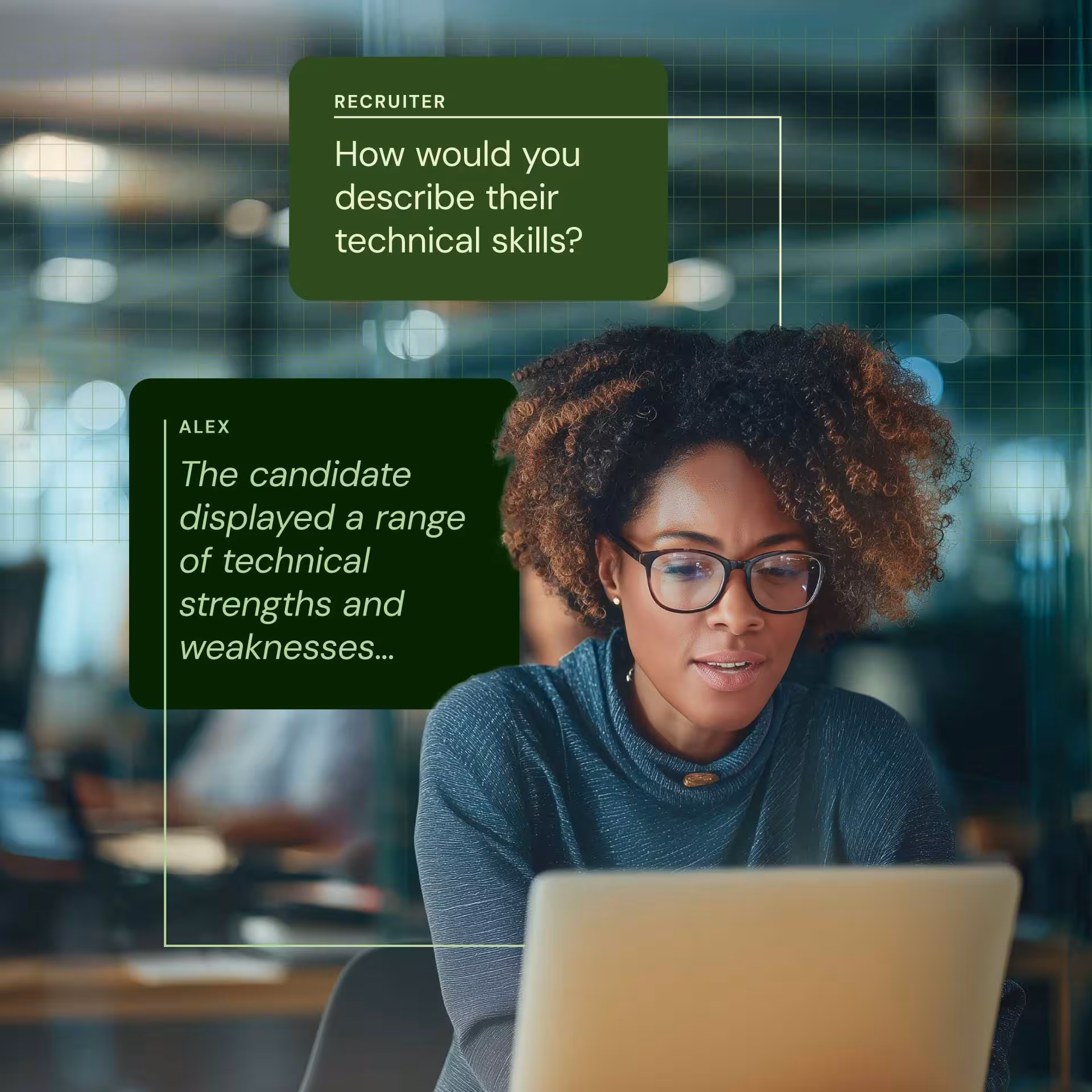 Two-way, human-like interviews over phone or video. Alex adapts questions in real time and captures candidate nuance with tone and context.