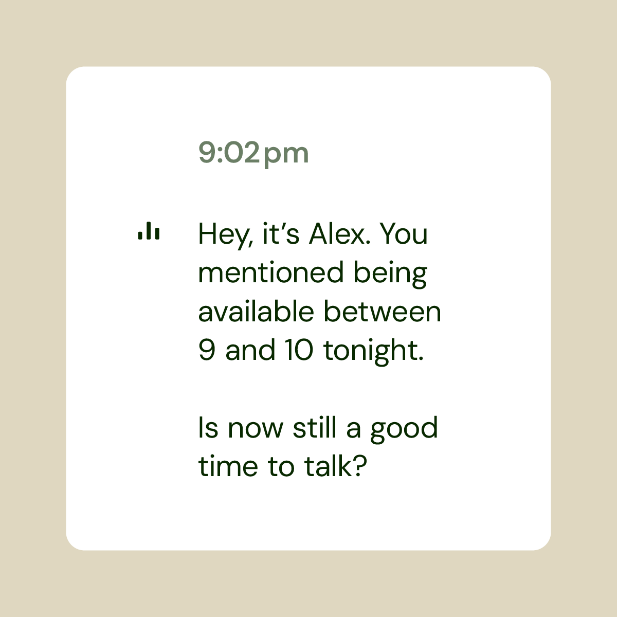 Bring voice intelligence to the traditional phone call. Alex can phone screen thousands of candidates daily, allowing you to engage candidates instantly and fill your calendar with pre-screened talent.