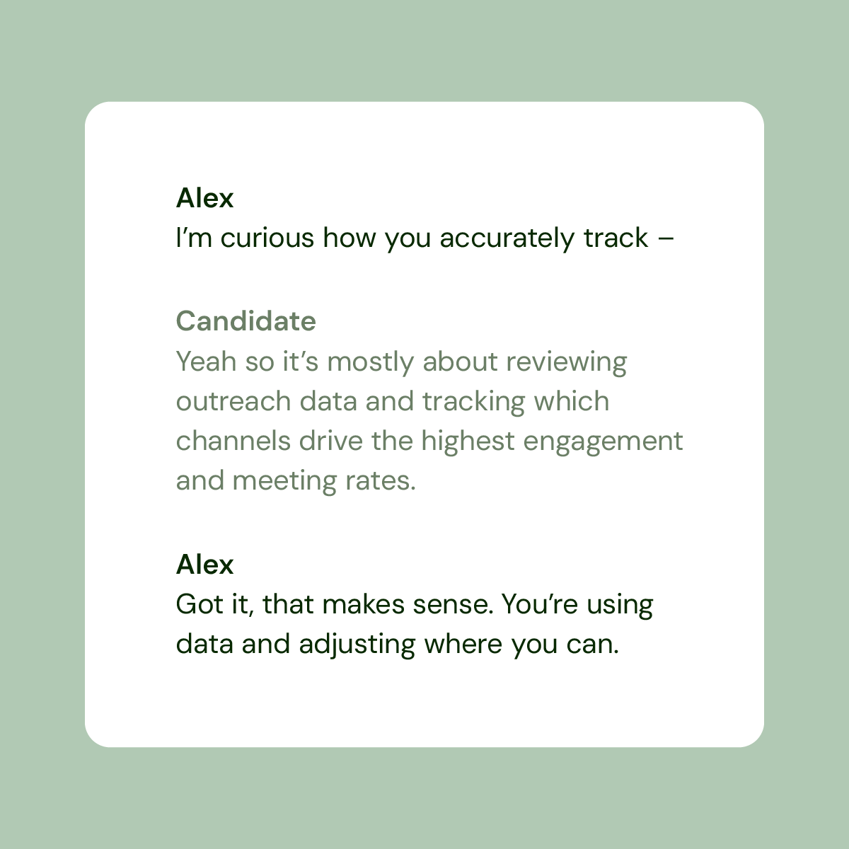 Alex functions like a supercharged recruiting associate: it asks smart questions, surfaces key insights, and dramatically speeds up our screening process. Our recruiters focus on deeper conversations and higher-value work.