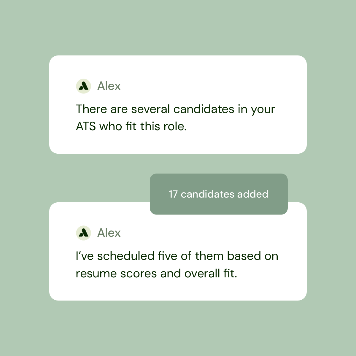 Alex transforms your archive into an active pipeline, proactively surfacing qualified candidates from past roles and engaging them with personalized outreach, turning cold data into booked interviews automatically