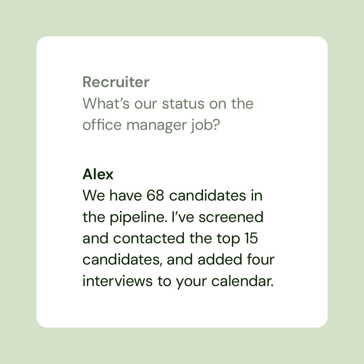Alex functions like a supercharged recruiting associate: it asks smart questions, surfaces key insights, and dramatically speeds up our screening process. Our recruiters focus on deeper conversations and higher-value work.